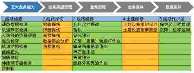 在轨道运维业务中,,,,,,,,,,,我们形成了完整的从业务能力(业务域)-业务流程-业务实体-数据模型的分析梳理过程。。。。。轨道运维业务能力如下图所示::::::