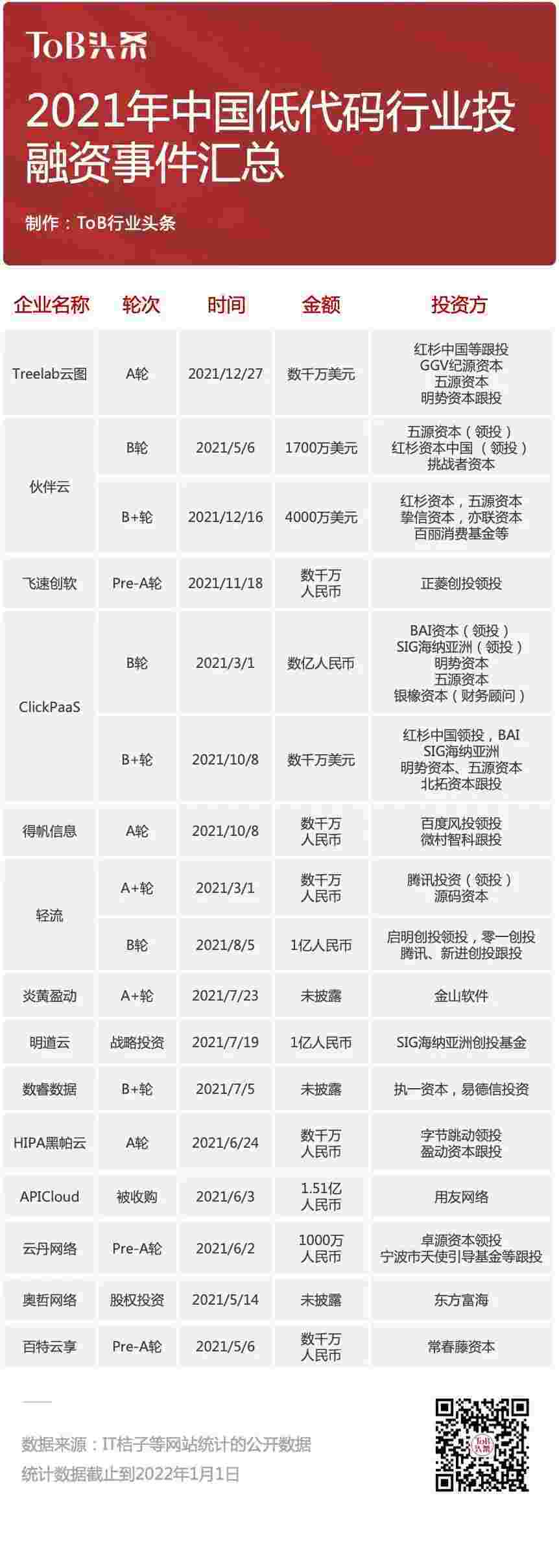 到2021年,,,,,,,无/低代码投融资规模势头更甚,,,,,,,,,,,其中包括轻流两轮融资(A+轮数千万人民币,,,,,B轮近亿人民币)、、、、、、、、小微钱包 两轮融资(B轮数亿人民币,,,,,,,,B+轮数千万美元)、、、、、、、、、百特云享数千万元Pre-A轮融资......
