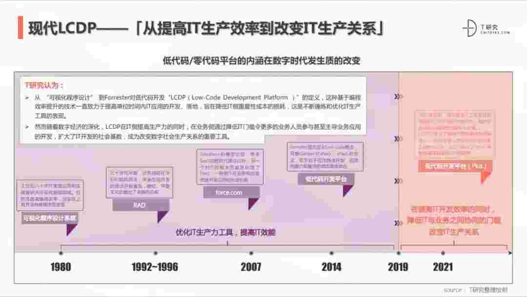 2020年前后,,,,,,源于提高IT工作者开发效能的LCDP不断进化和衍生,,,,,,,,面对业务导向日益明显的数字化变革。。。。。。。。。LCDP衍生出了面向不同对象的升级服务——面向专业人群的LCDP和业务人群的NCDP,,,,,,,,,,,,LCDP与NCDP的不同服务属性被逐渐认可和接受。。。。 LCDP在提高IT开发效率的同时,,,,,,,,,降低IT与业务之间协同的门槛改变IT生产关系。。。。。。。